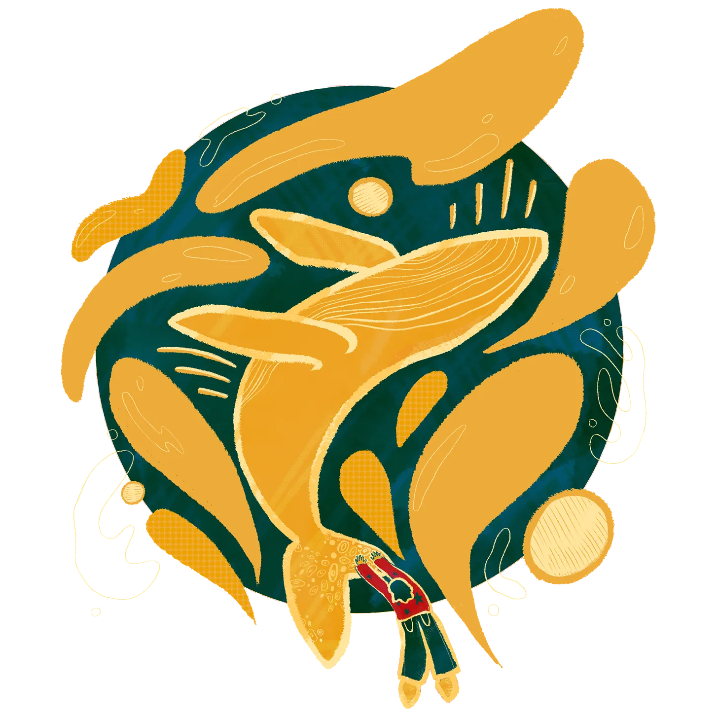 - It was time to add new key elements within the illustration. I was itching to incorporate a whale into the Filter Feeder brand somewhere. Y’all know I love my invertebrates (aka things without backbones), but baleen whales never fail to impress with their filter feeding strategies. I also wanted to incorporate humans in there — hence, the tiny girl hanging on for the ride.