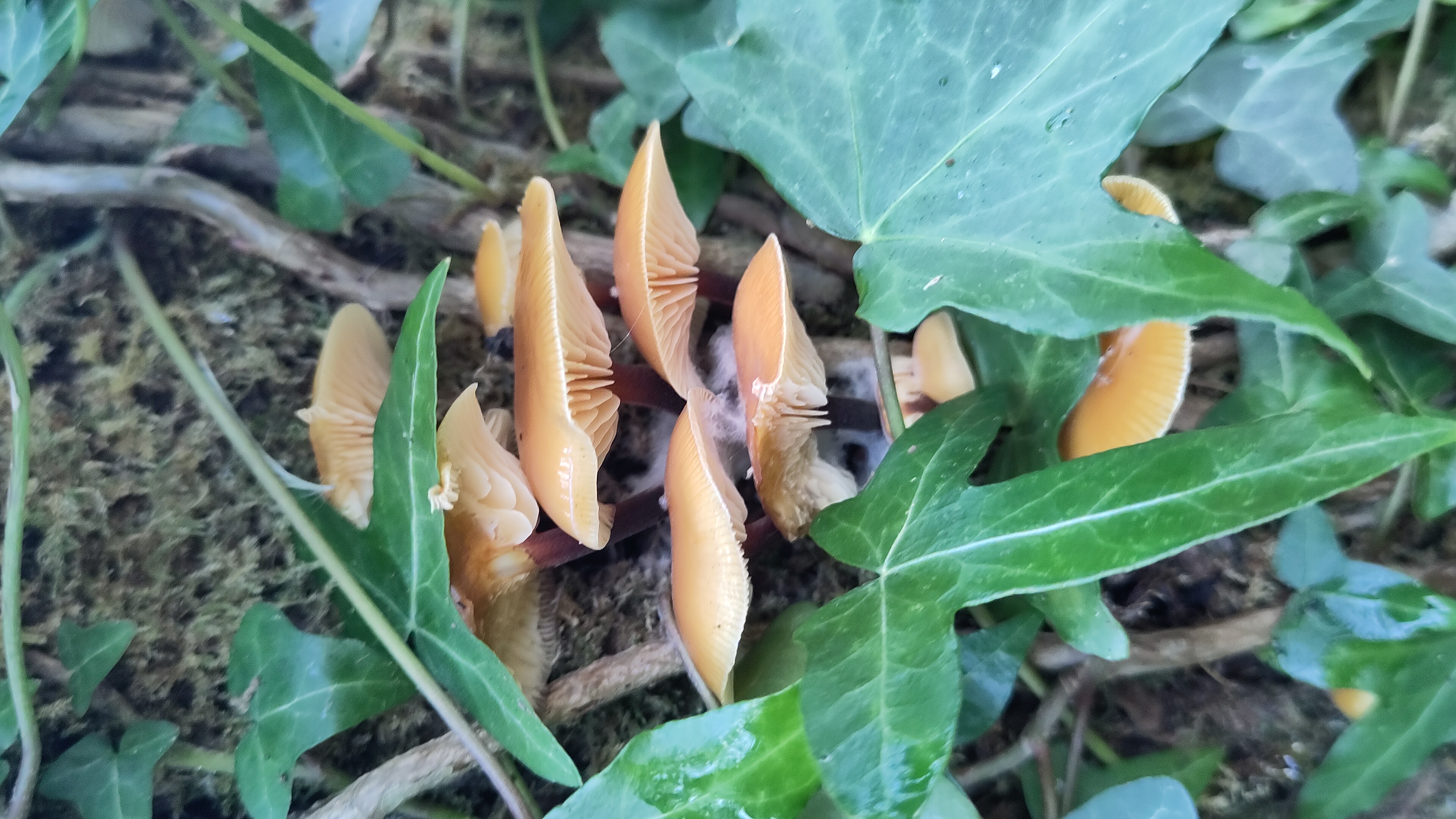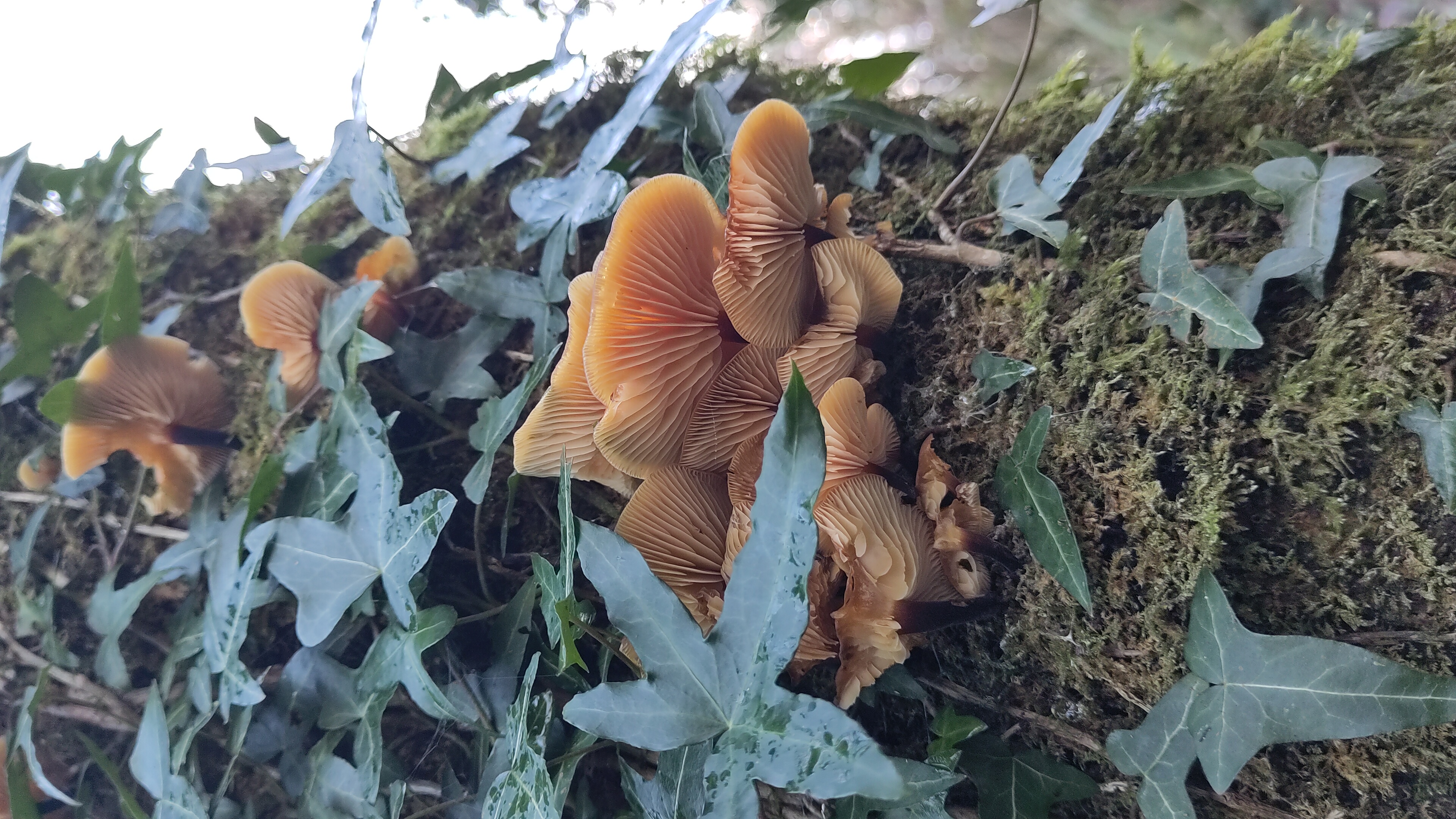 It’s very much the low season for fungi, so I don’t expect to find much. Until I venture up a hill I have never been up before, climbing over trees that have fallen in the recent storm and trying not to fall face first into the mud. I come across a small, ivy-covered tree in full bloom of fungi. Not oyster mushrooms this time, but velvet shanks.