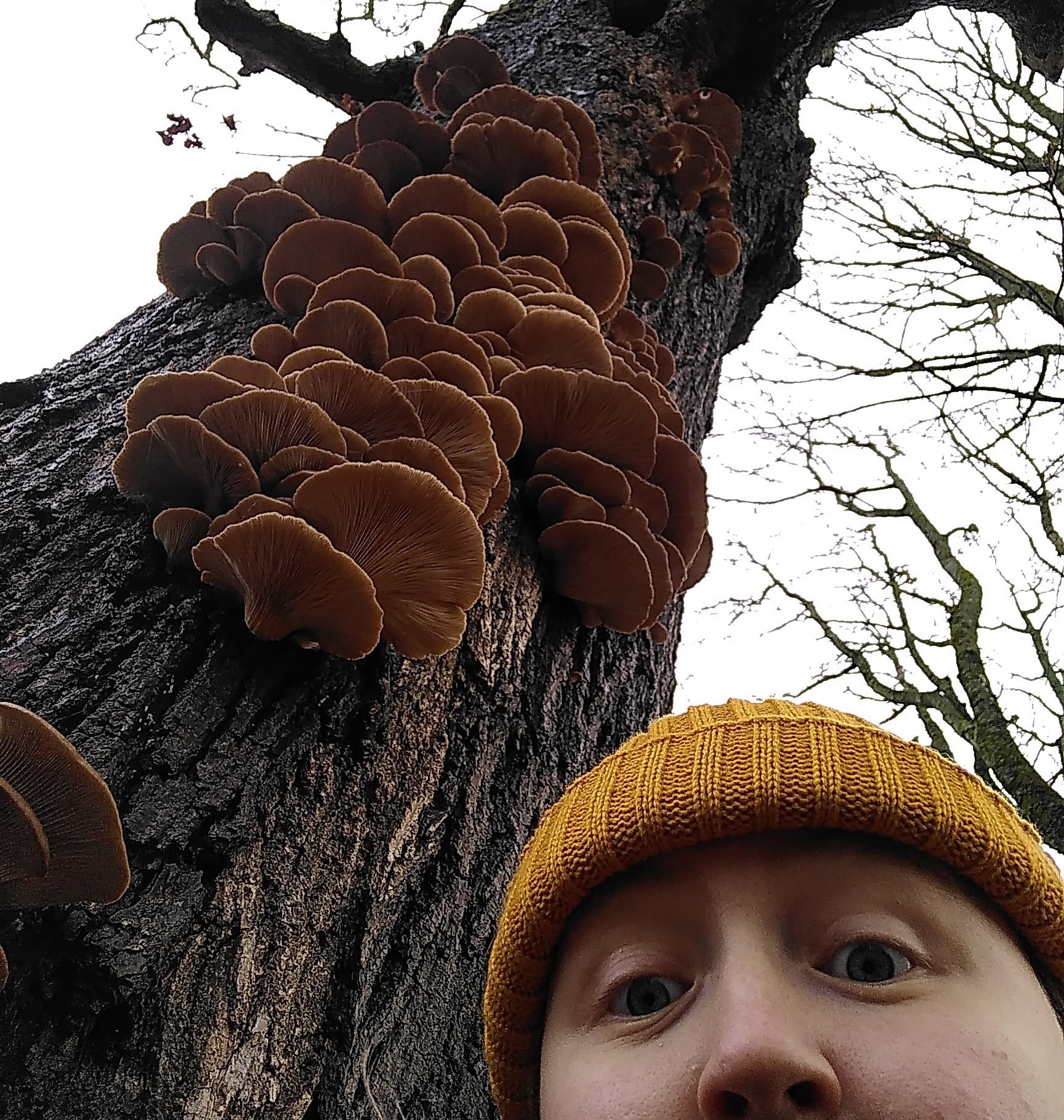 On a species-level I can now successfully ID mica ink caps, sulfur tufts, King Alfred cakes, oysterlings, scarlet elf cups, jelly ears, pestle puffballs, blushers, and beech jelly disks — to name a few. The number of selfies I now have with fungi? Probably hundreds.