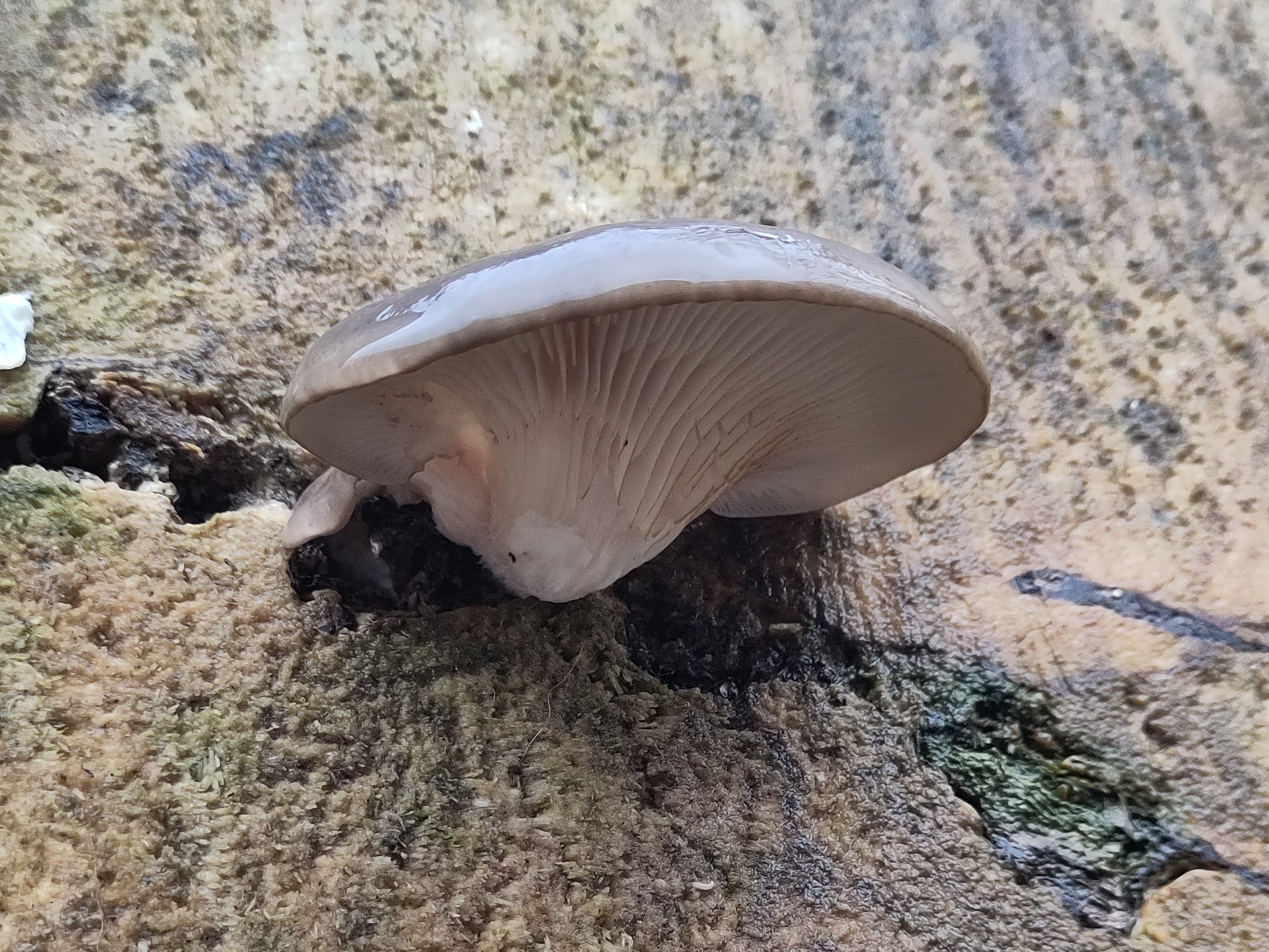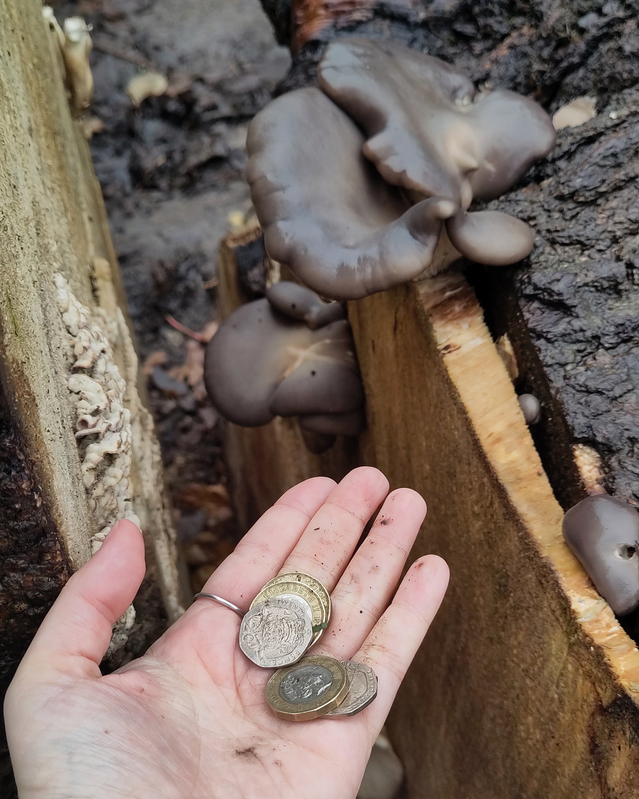 I walk over, tentatively, scared of what I might find. He’s still there, lying where I last left him. And what’s that? It’s oyster mushrooms! They’re growing out of the trunk again. They’ve adapted to the trees' felling, sitting along the trunk, their gills still facing the earth. Even more spectacularly, they’re growing in the cracks and crevices made by the chainsaw that felled this tree. Resilient dudes.