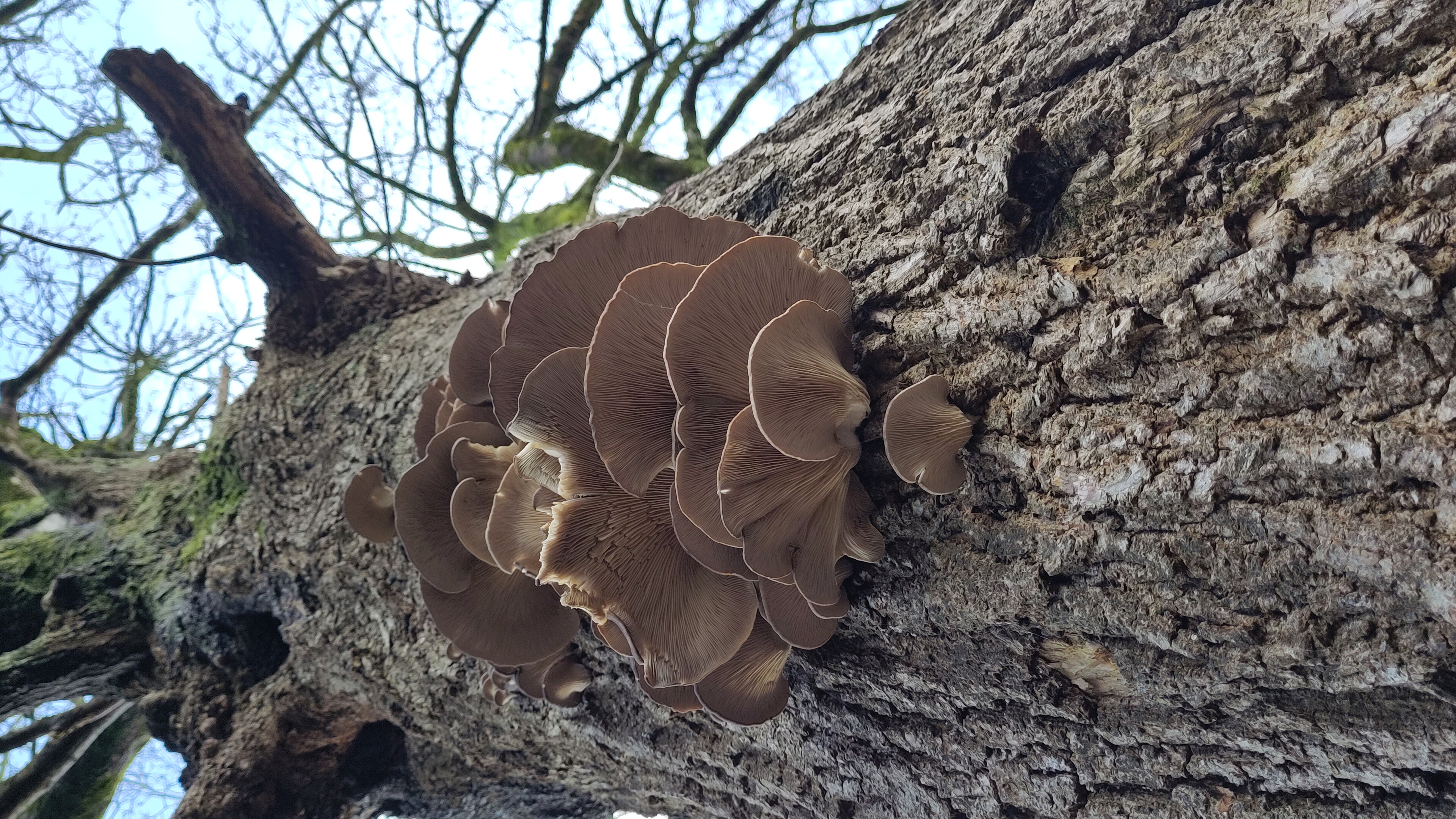 I think it’s a grey oyster mushroom? Seems about right. They’re a winter mushroom. They like to come after a frost, and it’s been pretty cold recently. They’re apparently quite safe to ID for beginners. They have a lookalike, oysterlings which never grow more than 4cm across. But some of the fungi above my head have to be at least 10cm. Huge. Impressive. There’s layer upon layer of beautiful gills, scalloped edges.