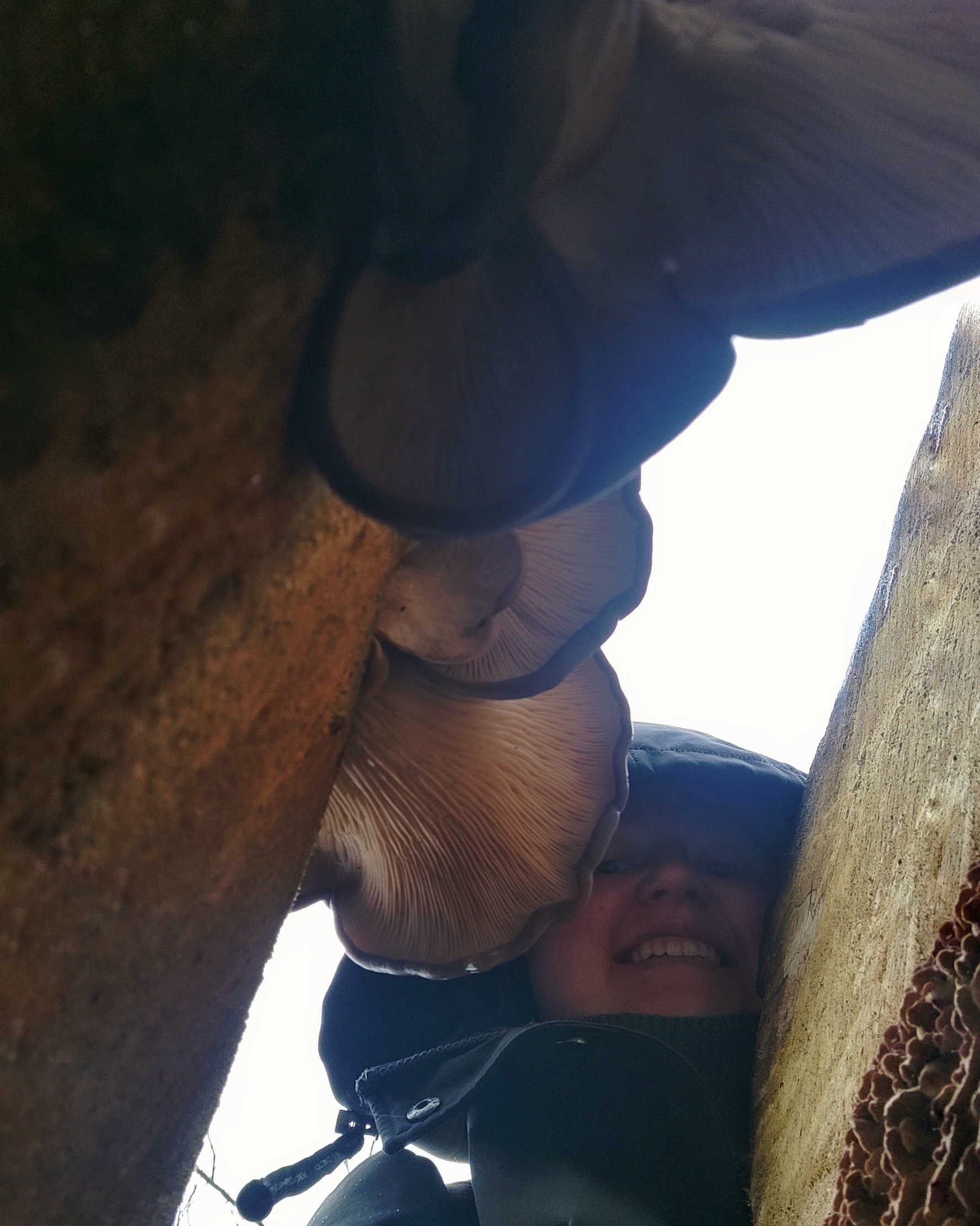 I realize that I feel instantly connected to this tree. It reminds me of the first time meeting the oyster mushroom tree. The awe I felt, the joy of finding this little piece of treasure! I take pictures, the obligatory selfies, observe every little flush (a batch or cluster of mushrooms), and marvel at this tree. Standing there covered in fungi.